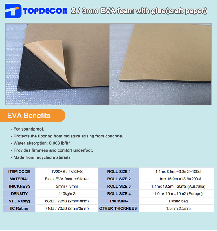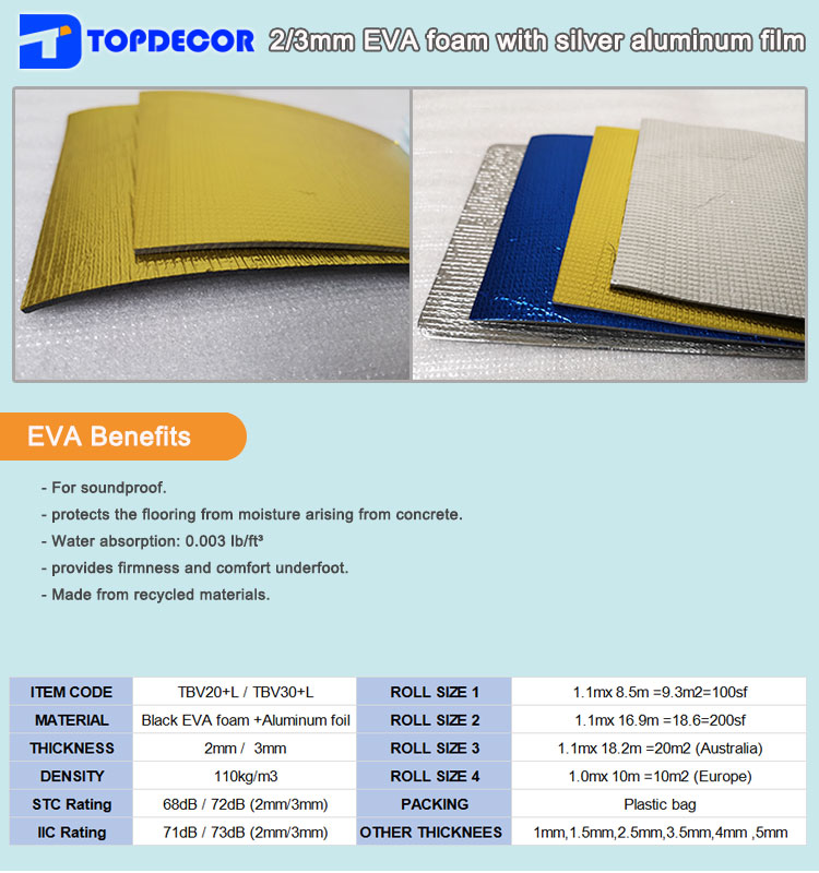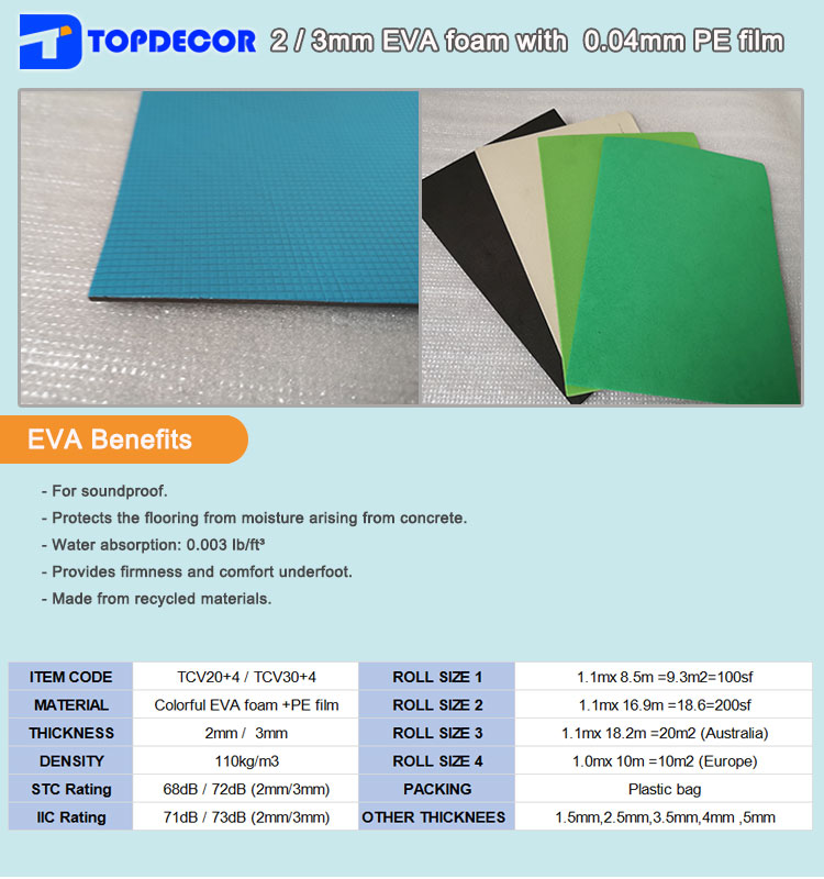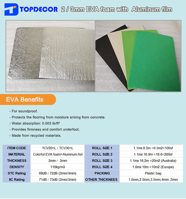 EVA (Ethylene-Vinyl Acetate) Underlayment is designed for using under floated laminate, bamboo and engineered wood floors and is ideal for many types of subflooring. This underlayment is with a 2 mm/3mm thickness foam layer that provides optimal cushioning and sound absorption, as well as a closed cell foam design that offers excellent moisture vapor resistance. It also coordinates the comfort with your floorings.
